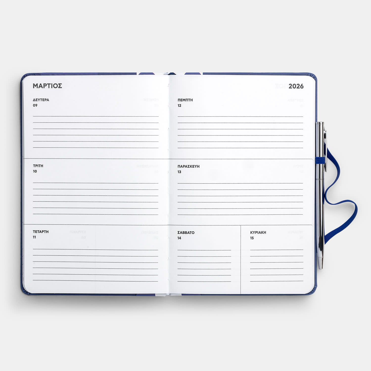 Ακαδημαϊκό ημερολόγιο Blue 2025-2026 από τη Sentio, για να κουβαλάς πάντοτε μαζί σου τα daily «to do». Διαθέτει ετήσιο πλάνο, υφασμάτινο σελιδοδείκτη για να βρίσκεις άμεσα τις σημειώσεις σου, αλλά και στυλό για να καταγράφεις απευθείας ό,τι θες! Επιπλέον, κλείνει με ένα κομψό λάστιχο για ασφάλεια.