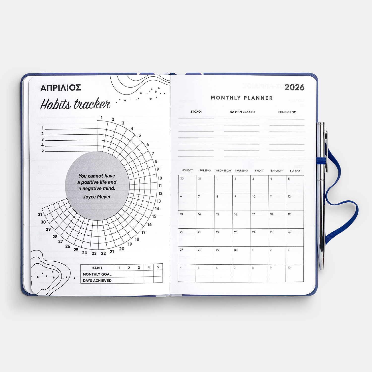 Τι το κάνει, όμως, να ξεχωρίζει; Μα φυσικά το Habit Tracker που διαθέτει στην αρχή κάθε μήνα, μαζί με ένα quote, που θα σε βοηθήσει να μην χάνεις την αυτοσυγκέντρωσή σου, όσον αφορά στην οικοδόμηση ισχυρών συνηθειών και στην επίτευξη των στόχων σου. Πώς θα το πετύχεις; Επίλεξε 5 συνήθειες που θέλεις να ενσωματώσεις στη ρουτίνα σου και κατάγραψε καθημερινά την επίτευξη τους. Κι έτσι, θα δεις πώς ένα ημερολόγιο μετατρέπεται σε gamechanger!