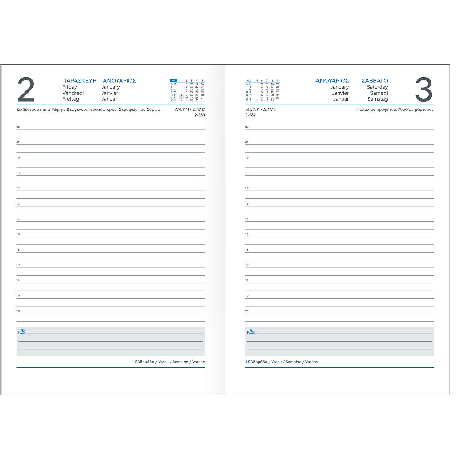 Το ημερολόγιο της Sentio, σε μοναδικό σχέδιο Squares, αποτελεί τον πιο τέλειο και αξιόπιστο τρόπο για την οργάνωση των meeting και των εκκρεμοτήτων σου σε ημερήσια βάση. Είναι φτιαγμένο για εσένα που θέλεις να τα έχεις όλα υπολογισμένα, οργανώνοντας από πριν και με κάθε λεπτομέρεια τις δουλειές σου. Κι επειδή και τα Σαββατοκύριακα είναι… γεμάτα, το Σάββατο και η Κυριακή απεικονίζονται σε ολόκληρες σελίδες, για να υπάρχει χώρος να σημειώνεις τα πάντα!