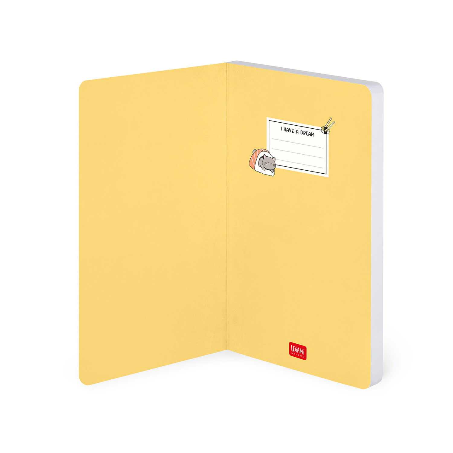 Στο σημειωματάριο Sushi Cat της Legami θα βρεις μια δόση… σούσι & χνουδωτής τρέλας! Με 164 ριγέ σελίδες από υψηλής ποιότητας λευκό χαρτί 120g/m², προσφέρει ιδανική εμπειρία γραφής, ενώ οι τελευταίες 24 σελίδες είναι αποσπώμενες για έξτρα πρακτικότητα. Η πίσω εσωτερική τσέπη κρατάει αποδείξεις, μικρές σημειώσεις ή… μυστικά, και το compact μέγεθός του 12,5 x 18cm το κάνει ιδανικό για την τσάντα σου.