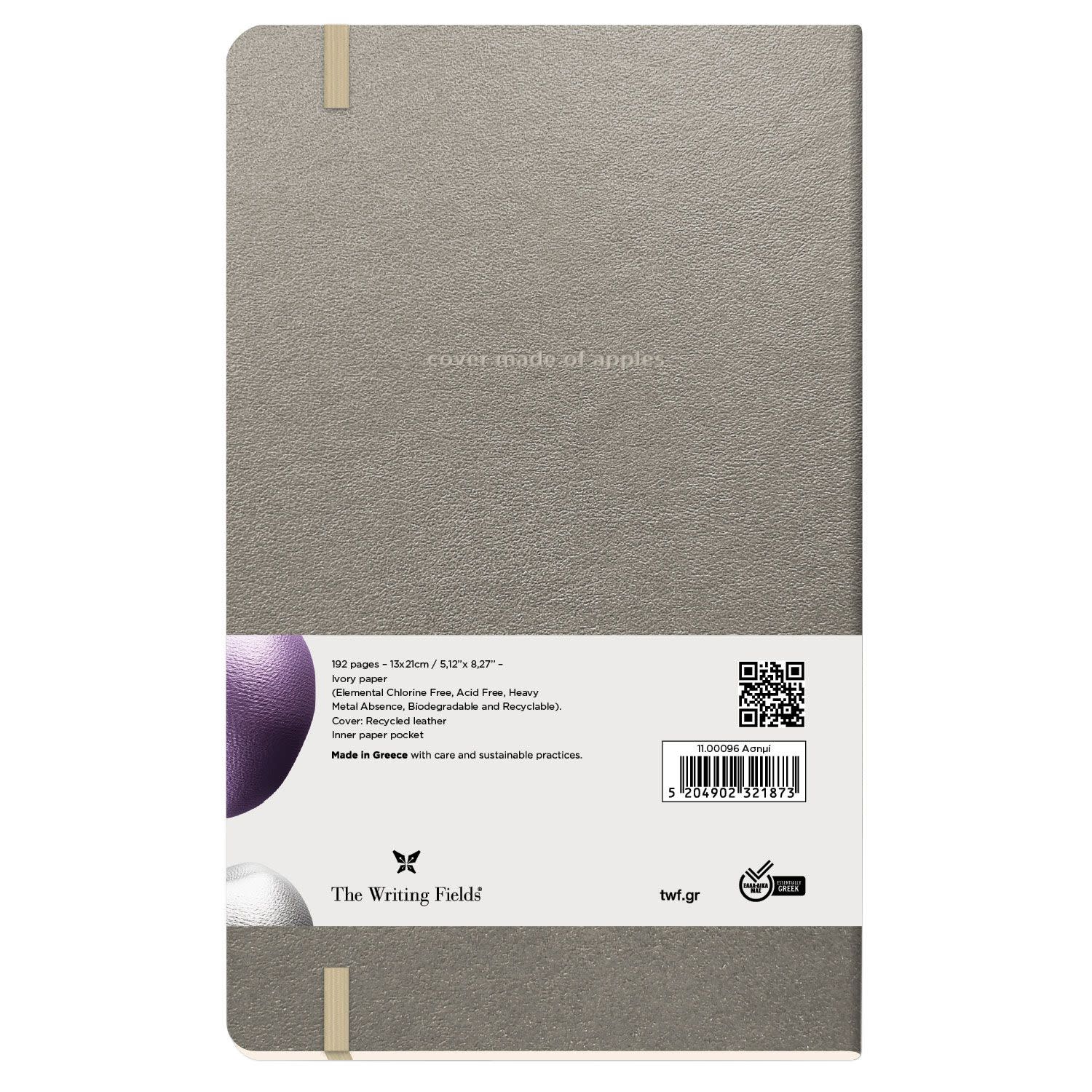 Σημειωματάριο σε μέγεθος 13 x 21 με οικολογικό εξώφυλλο από ανακυκλωμένα μήλα σε χρυσές, ασημί και λιλά αποχρώσεις. Είναι εδώ για να φέρει μια νέα διάσταση στο πως βλέπουμε σήμερα την οικολογία, που μπορεί εκτός από απόλυτα φυσική να είναι έντονη, γιορτινή και ανέμελα εξωστρεφής, σαν να έχει βγει από παραμύθι.