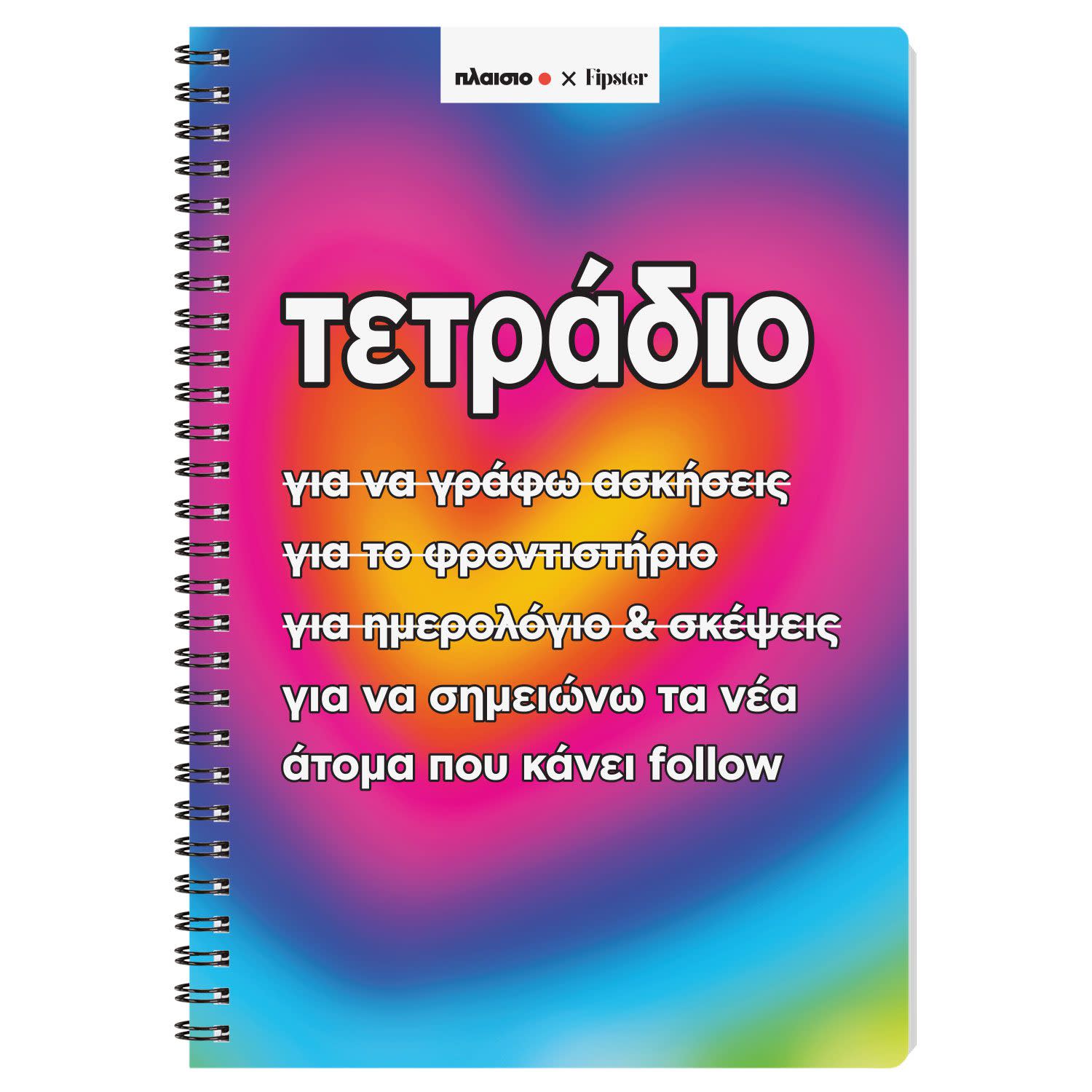 Το τετράδιο σπιράλ Β5 «Follow» δημιουργήθηκε σε συνεργασία με τον Fipster και διαθέτει χάρτινο πλαστικοποιημένο εξώφυλλο, ιδανική επιλογή για εσένα, που θες να ξεχωρίζεις στο σχολείο ή στο πανεπιστήμιο!