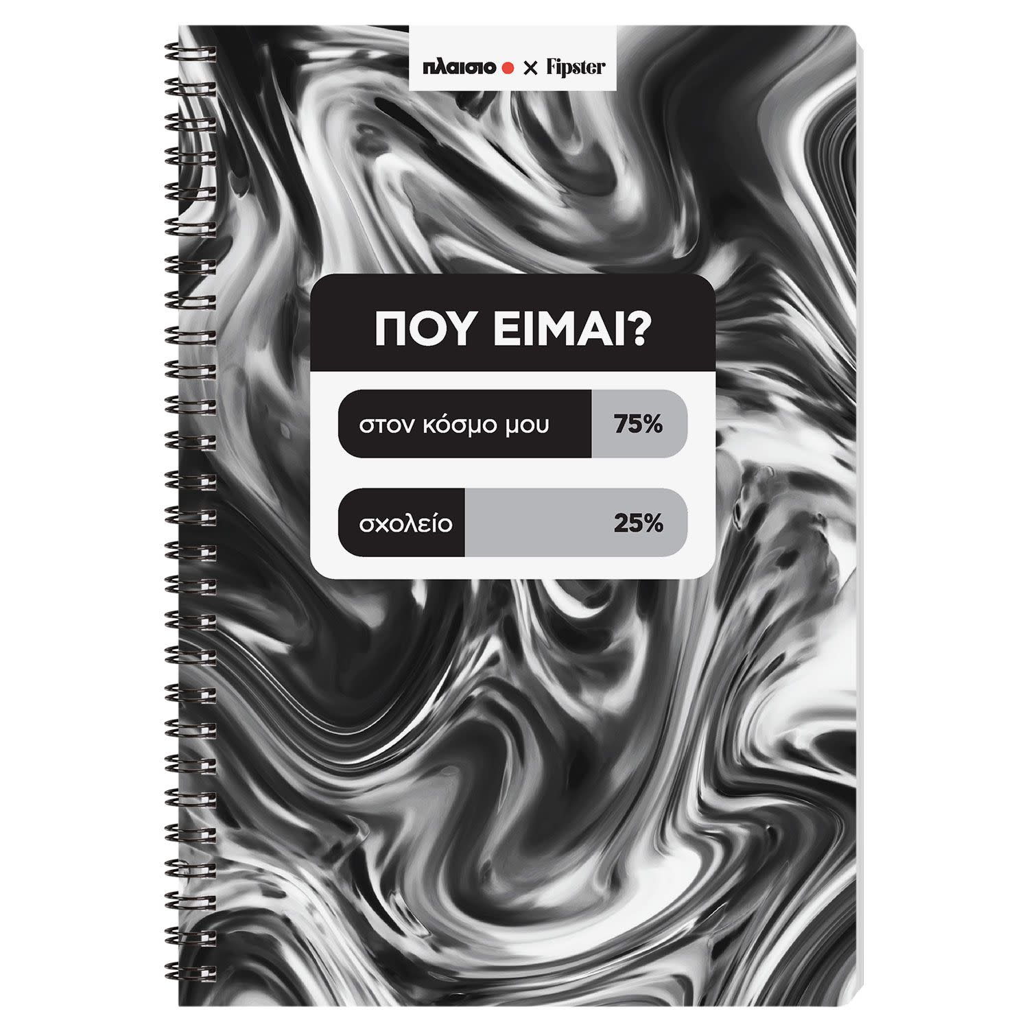 Το τετράδιο σπιράλ Β5 «Που είμαι» δημιουργήθηκε σε συνεργασία με τον Fipster και διαθέτει χάρτινο πλαστικοποιημένο εξώφυλλο, ιδανική επιλογή για εσένα, που θες να ξεχωρίζεις στο σχολείο ή στο πανεπιστήμιο! Το οπισθόφυλλο είναι από χαρτί 265gr, για να προστατεύεται και η τελευταία σελίδα, ενώ οι εσωτερικές σελίδες είναι από χαρτί 70gr με ριγέ γραμμογράφηση για καθαρή γραφή και καλογραμμένες σημειώσεις!