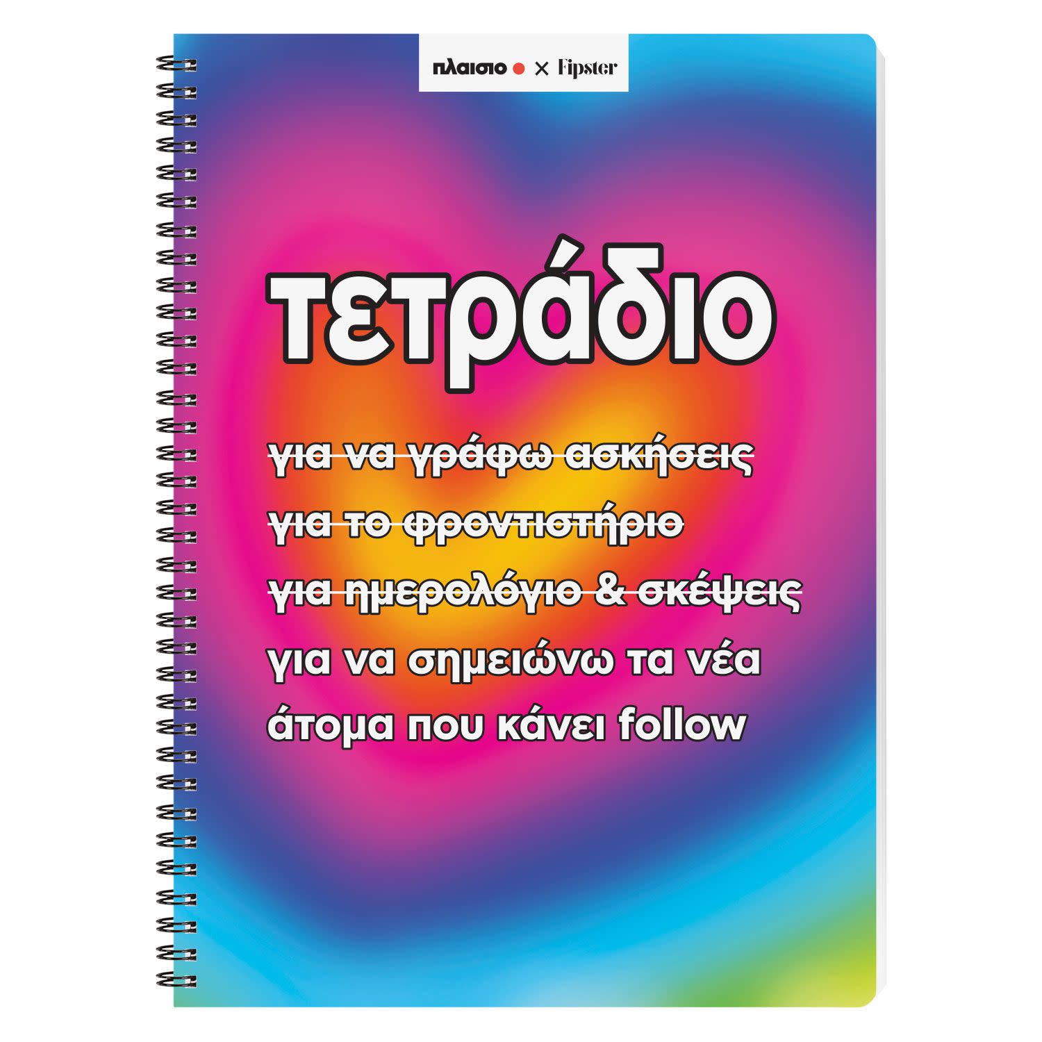 Το τετράδιο σπιράλ A4 «Follow» δημιουργήθηκε σε συνεργασία με τον Fipster και διαθέτει χάρτινο πλαστικοποιημένο εξώφυλλο, ιδανική επιλογή για εσένα, που θες να ξεχωρίζεις στο σχολείο ή στο πανεπιστήμιο!