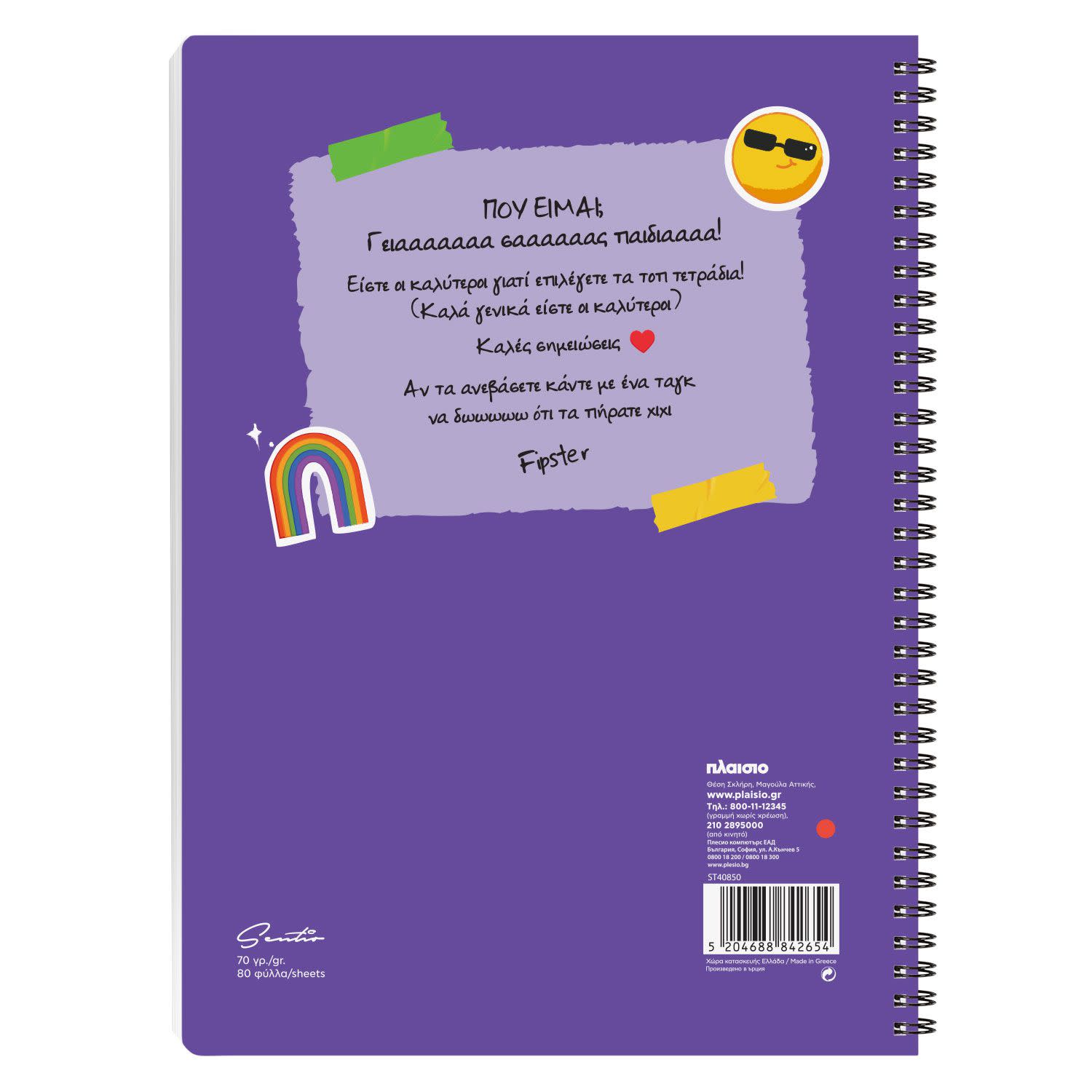 Το οπισθόφυλλο είναι από χαρτί 265gr, για να προστατεύεται και η τελευταία σελίδα, ενώ οι εσωτερικές σελίδες είναι από χαρτί 70gr με ριγέ γραμμογράφηση, για καθαρή γραφή και καλογραμμένες σημειώσεις!