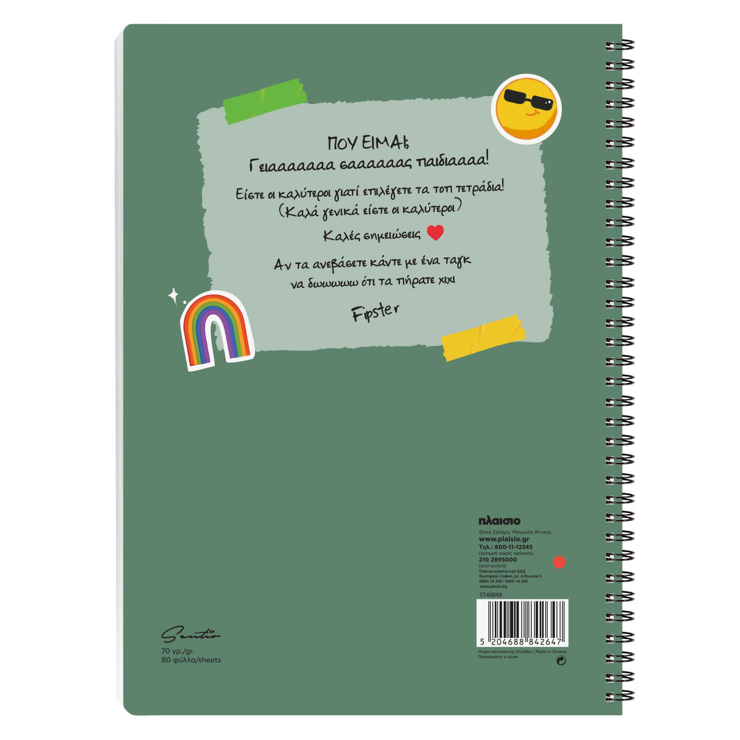Το οπισθόφυλλο είναι από χαρτί 265gr, για να προστατεύεται και η τελευταία σελίδα, ενώ οι εσωτερικές σελίδες είναι από χαρτί 70gr με ριγέ γραμμογράφηση, για καθαρή γραφή και καλογραμμένες σημειώσεις!
