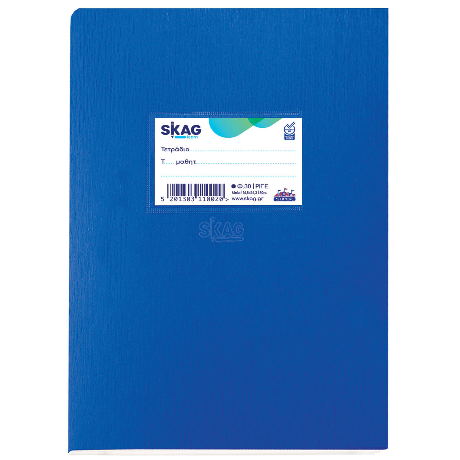 Εξοπλίσου κατάλληλα για όλα τα μαθήματα στο σχολείο ή στο φροντιστήριο με το κλασικό τετράδιο Skag 30 φύλλων από μπλε PVC εξώφυλλο. Διαθέτει θήκη με αποσπώμενη ετικέτα, για να γράφεις τα στοιχεία σου και ριγέ γραμμογράφηση 9mm στις σελίδες του, για να κρατάς καθαρές και οργανωμένες σημειώσεις.