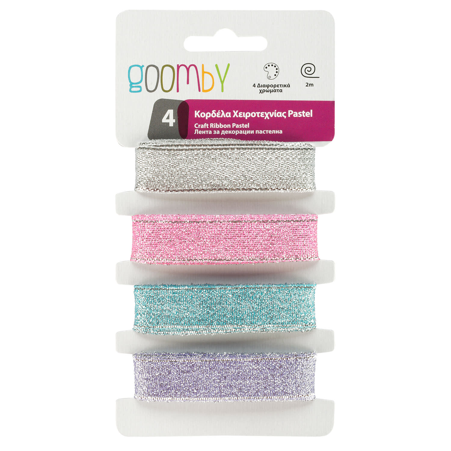 Φτιάξε τα δικά σου κοσμήματα, στόλισε τις DIY κατασκευές σου και τύλιξε μόνος τα δώρα σου, με τις κορδέλες χειροτεχνίας Goomby, σε pastel απόχρώσεις! Σε 4 διαφορετικά χρώματα. Διαστάσεις: 2m/κορδέλα.