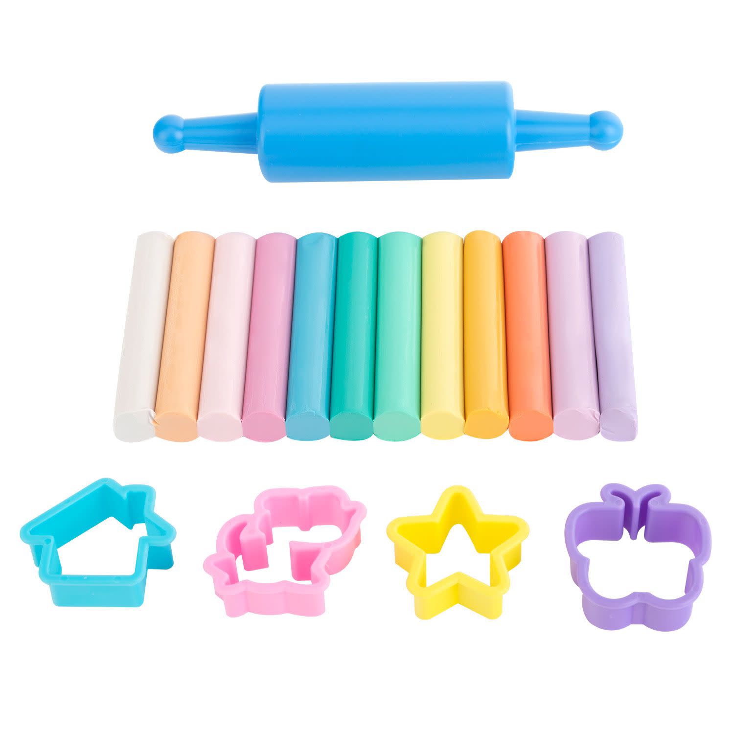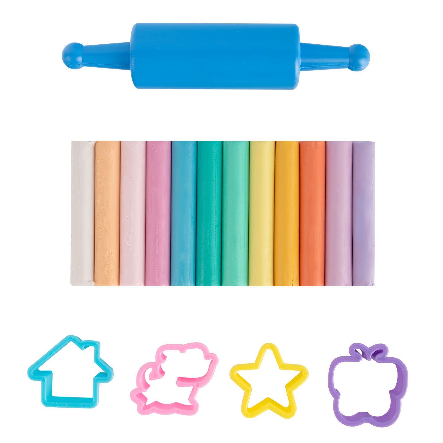 Σετ πλαστελίνης με 12 τεμάχια σε παστέλ χρώματα, πλάστη και 4 καλουπάκια, για να πλάθεις τις δικές σου πολύχρωμες δημιουργίες!