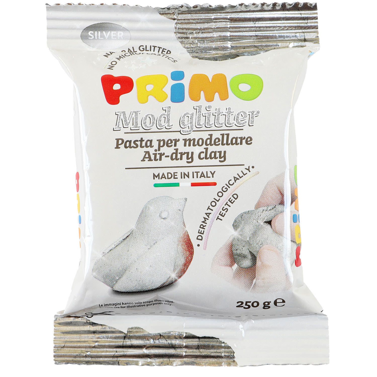 Πηλός χρώματος ασημί με glitter, σε συσκευασία 250gr Primo. Είναι δερματολογικά ελεγμένος, με bio-glitter που δεν περιέχει μικροπλαστικά. Είναι vegan, δεν περιέχει γλουτένη, είναι άοσμος και δεν απαιτεί ψήσιμο, καθώς στεγνώνει φυσικά στον αέρα.