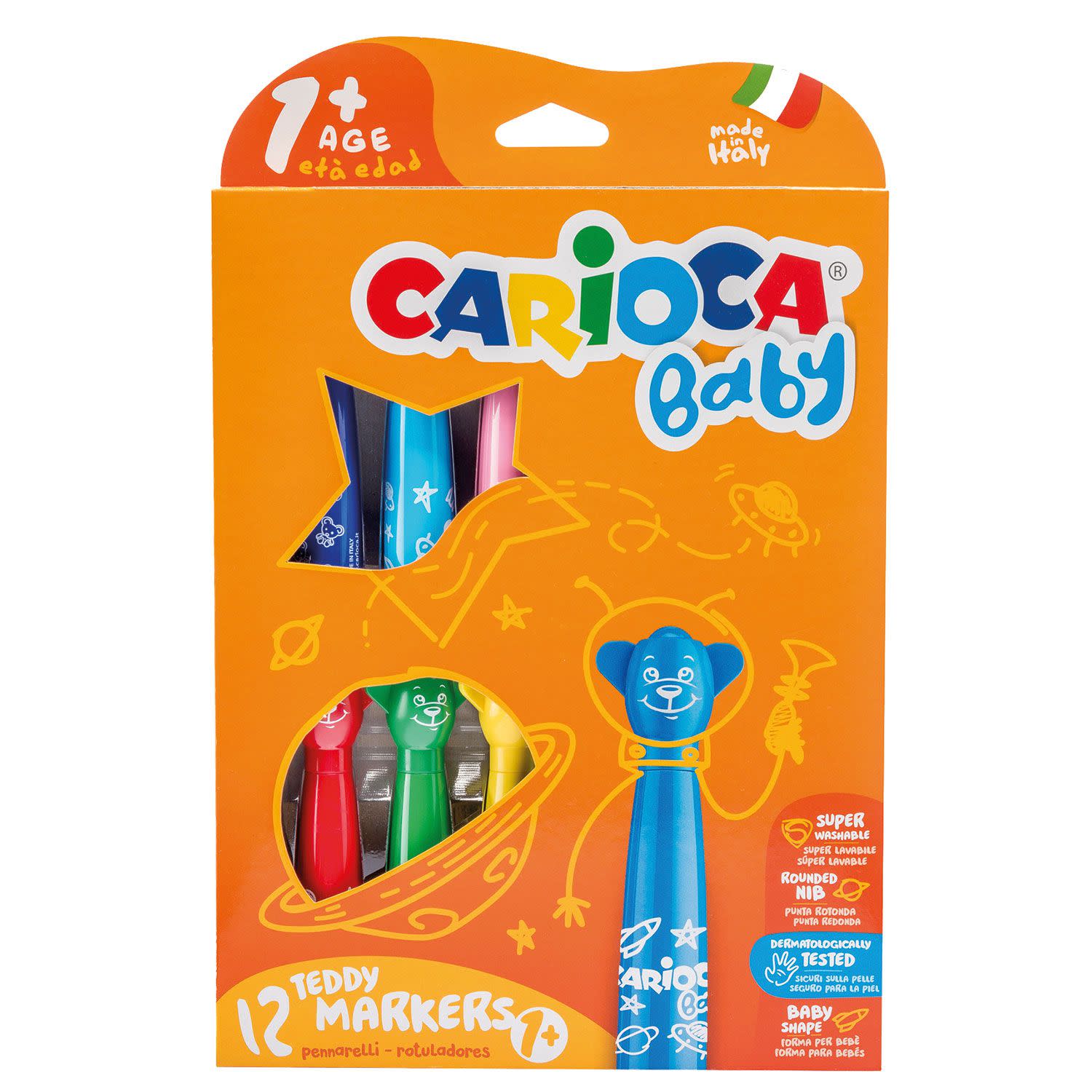 Μαρκαδόροι Baby Teddy της Carioca σε σετ 12 τεμαχίων, με εργονομικό σχήμα σχεδιασμένο για σταθερό κράτημα.