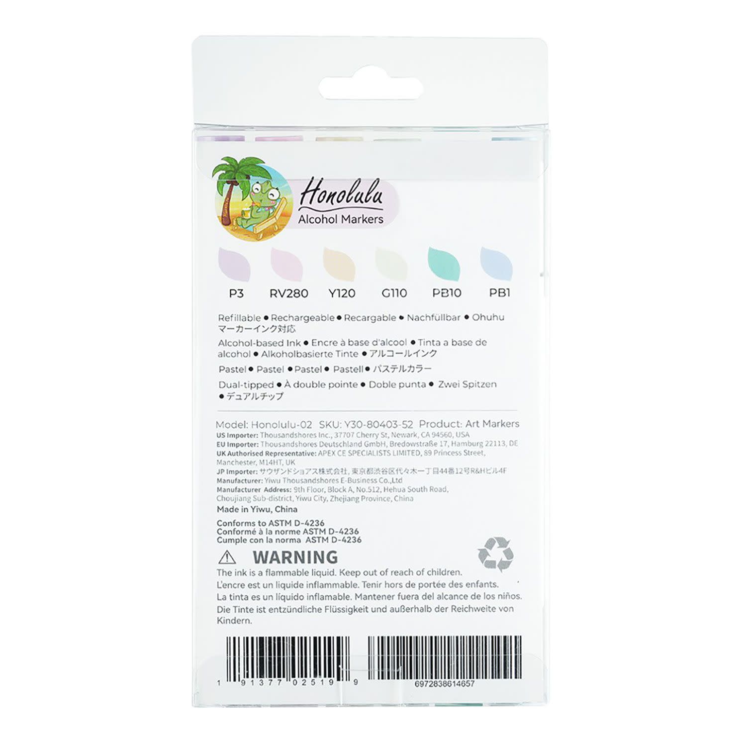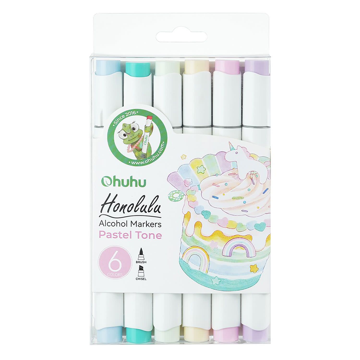 Μαρκαδόροι αλκοόλης Ohuhu Honolulu σε σετ των 6 τεμαχίων. Διαθέτουν διπλή μύτη Brush & Chisel, σε 6 pastel αποχρώσεις (P3, RV280, Y 120, G110, PB10, PB1). Είναι κατάλληλοι για εικονογράφηση, καθώς διευκολύνουν στην ανάμειξη χρωμάτων και στεγνώνουν πολύ γρήγορα!
