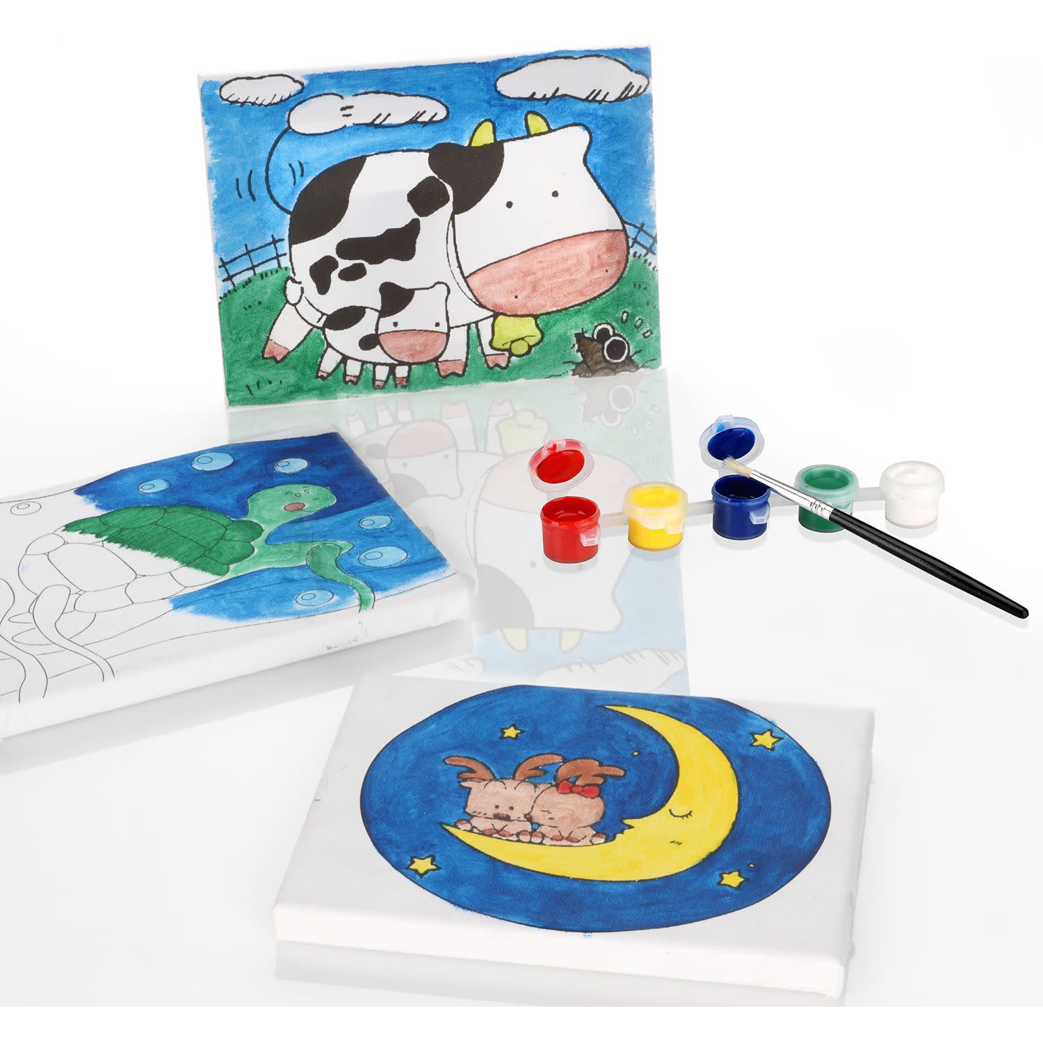 Η συσκευασία περιλαμβάνει ένα τελάρο 15x20cm, 5 ακρυλικά χρώματα και 1 πινελάκι ζωγραφικής.