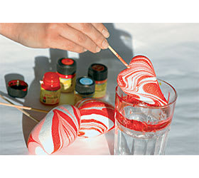 Αρχικά γέμισε ένα δοχείο με κρύο νερό. Ανακίνησε καλά το χρώμα, ρίξε λίγες σταγόνες στο κέντρο του δοχείου και ανακατεύοντας δημιούργησε ένα μοτίβο. Όσο περισσότερα χρώματα προσθέσεις, τόσο πιο εντυπωσιακό το αποτέλεσμα.Βήμα 2