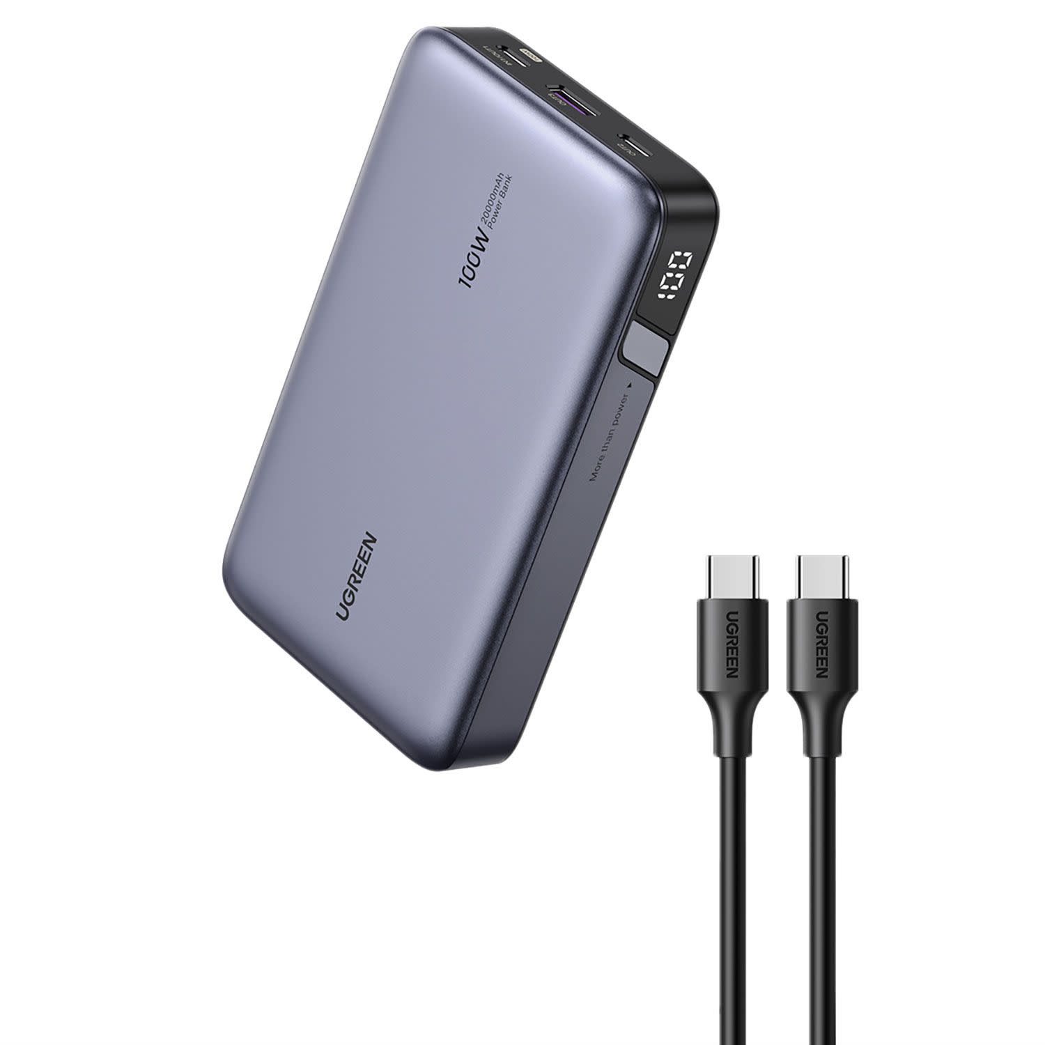 Powerbank με χωρητικότητα μπαταρίας 20.000mAh, υποστήριξη ταχείας φόρτισης 100W, τρείς θύρες (2x USB-C, 1x USB-A) και οθόνη LED που δείχνει το ποσοστό της μπαταρίας που απομένει.