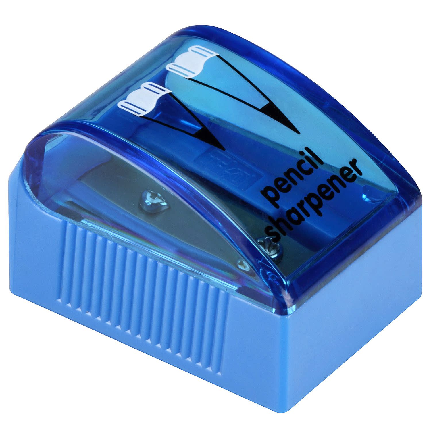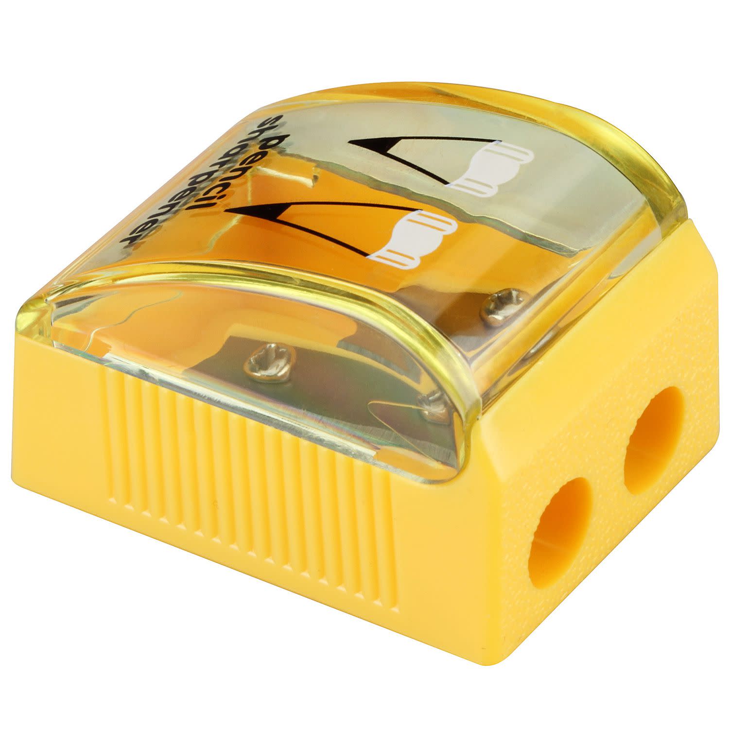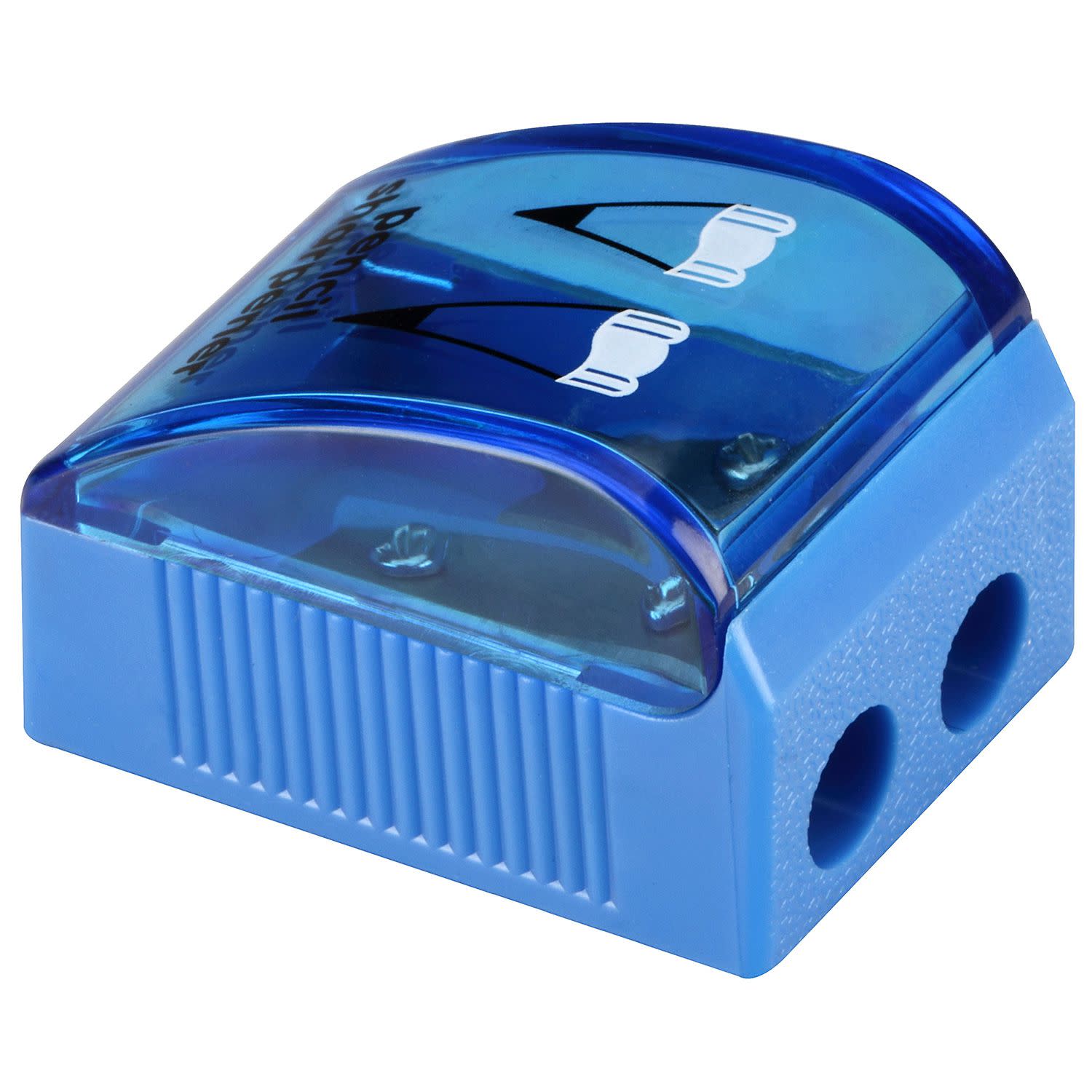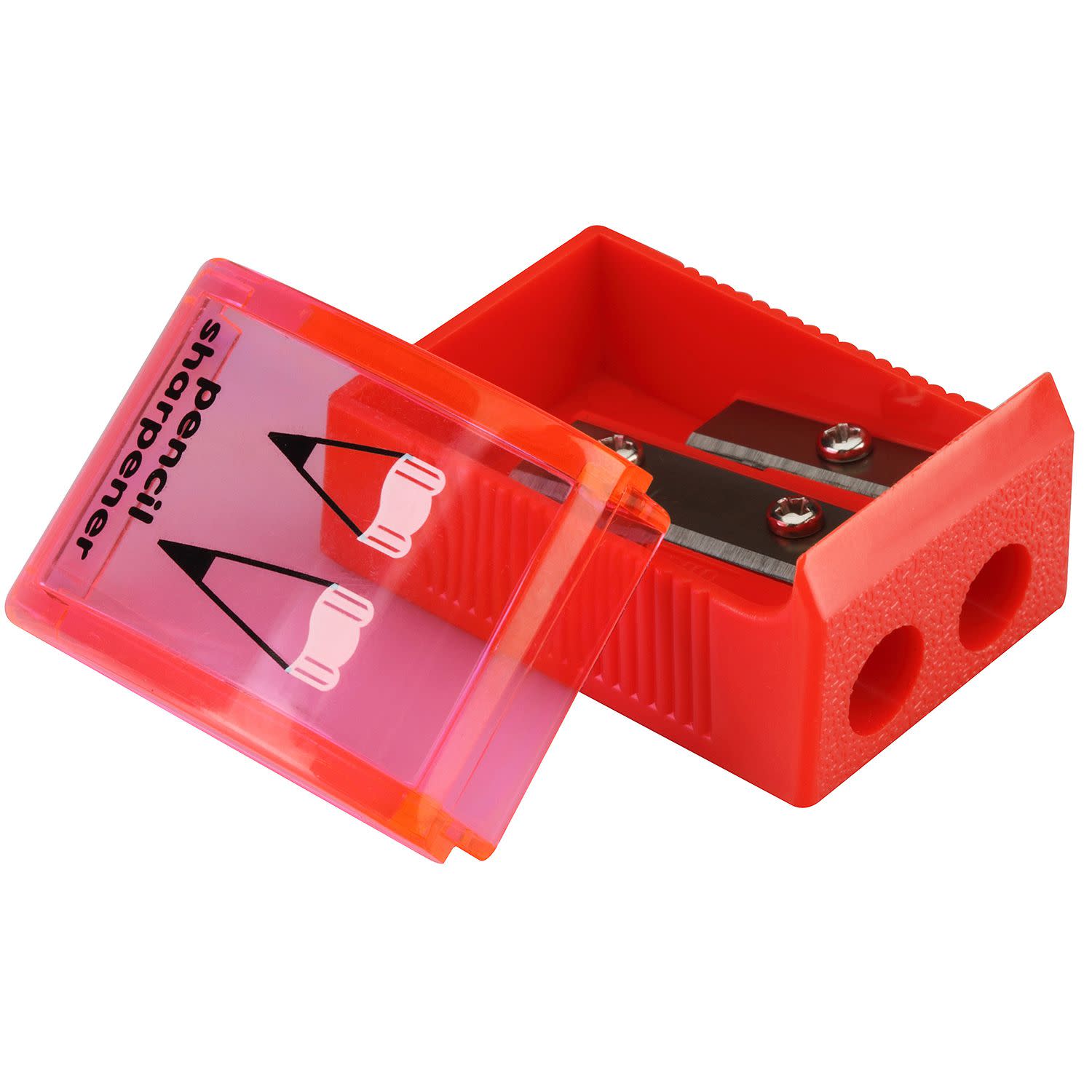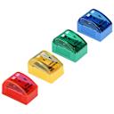 Πλαστική ξύστρα με αποθηκευτικό χώρο σε πολύχρωμο πλαστικό δοχείο τύπου βαρελάκι με διπλή υποδοχή, κατάλληλη για μολύβια κανονικής ή μεγάλης διαμέτρου και για ξυλομπογιές.