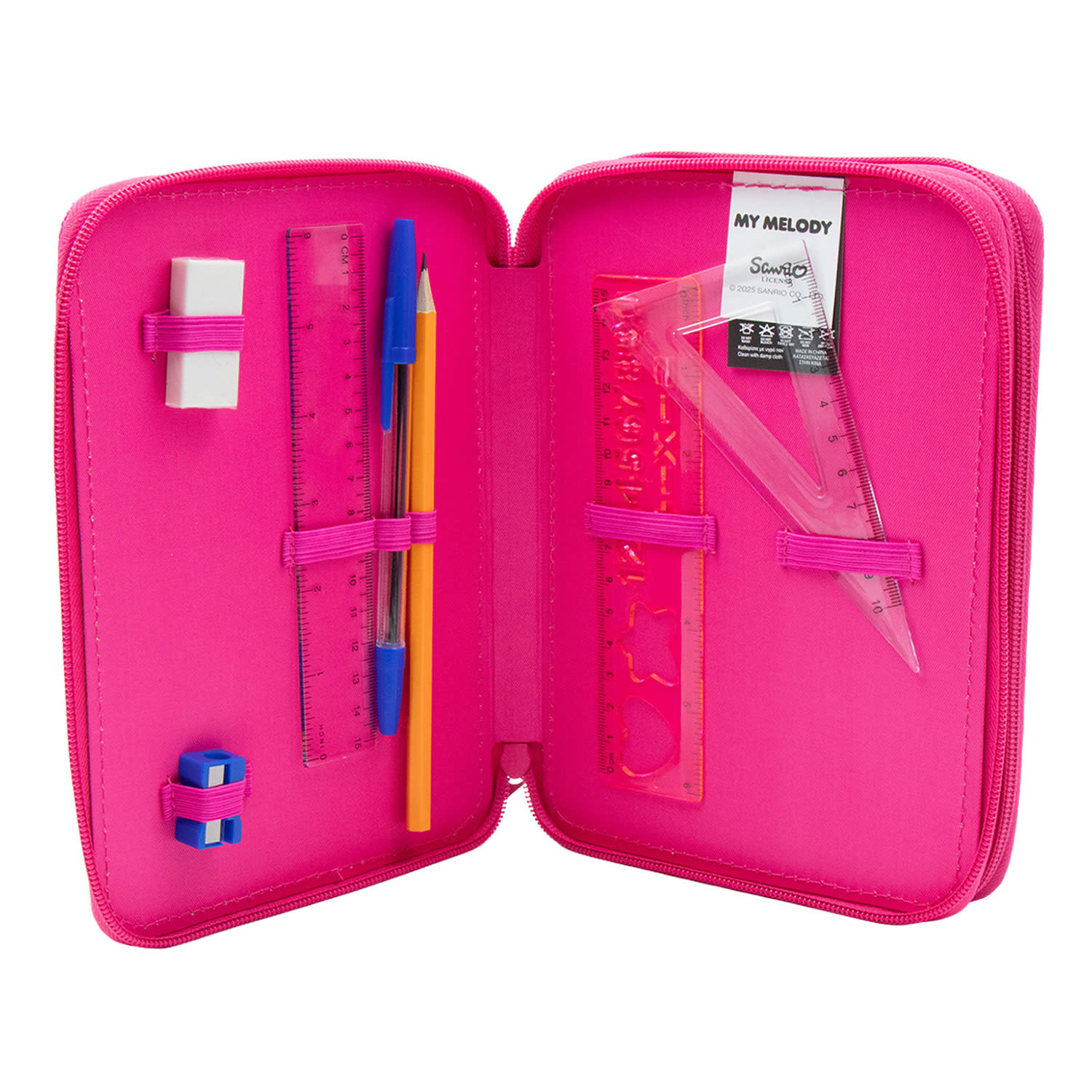 Η γεμάτη κασετίνα My Melody διαθέτει όλη την απαραίτητη γραφική ύλη και προσφέρει την κατάλληλη οργάνωση, ασφαλή μεταφορά και φύλαξη όλων των ειδών γραφής στο σχολείο. Η κασετίνα περιέχει στυλό, μολύβι, γόμα, ξύστρα, χάρακες, ξυλομπογιές και μαρκαδόρους. Μια εντυπωσιακή κασετίνα που θα σε ενθουσιάσει!