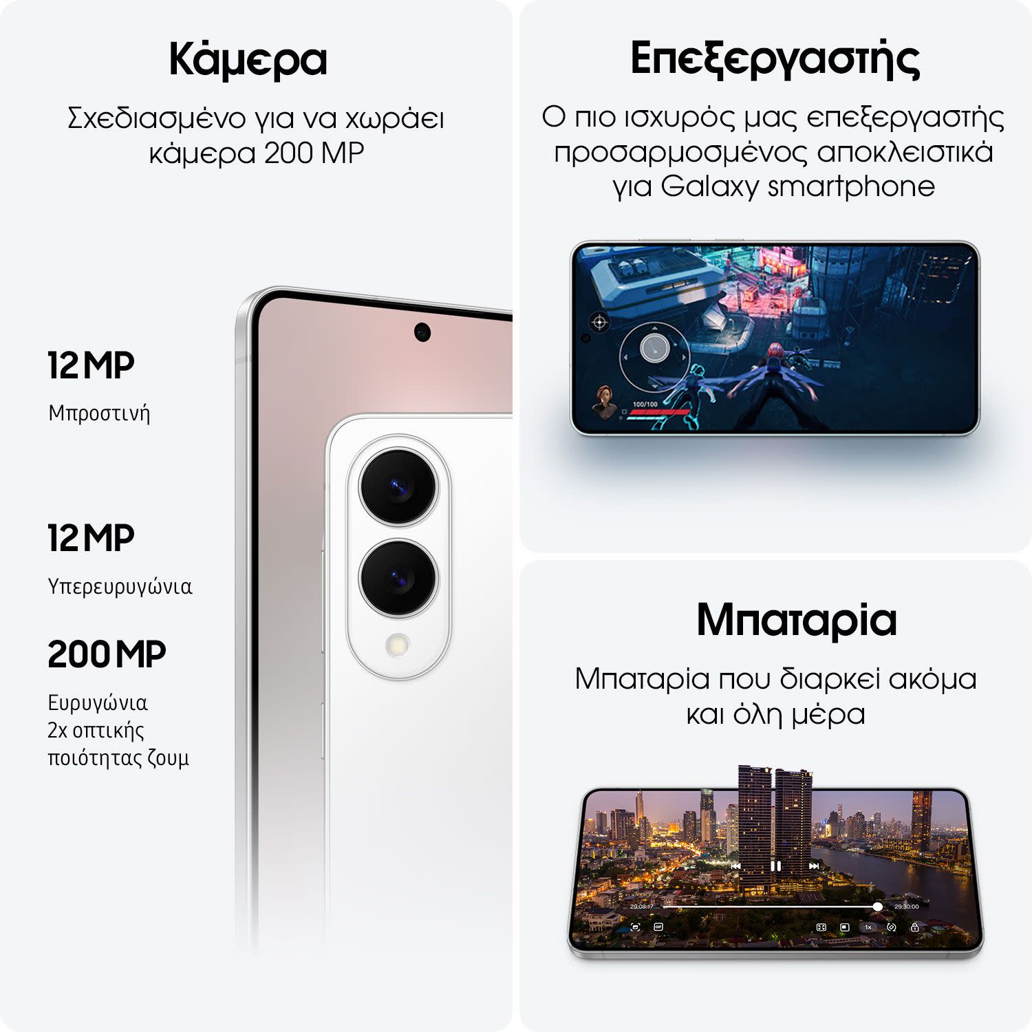 Το λεπτότερο Galaxy! Με ΑΙ, οθόνη 6,7” Dynamic AMOLED 2X Quad HD+, Qualcomm® Snapdragon® 8 Elite for Galaxy, κύρια κάμερα 200 MP (f:/1.7), υπερευρυγώνια 12 MP (f:/2.2) και εμπρόσθια κάμερα 12 MP.