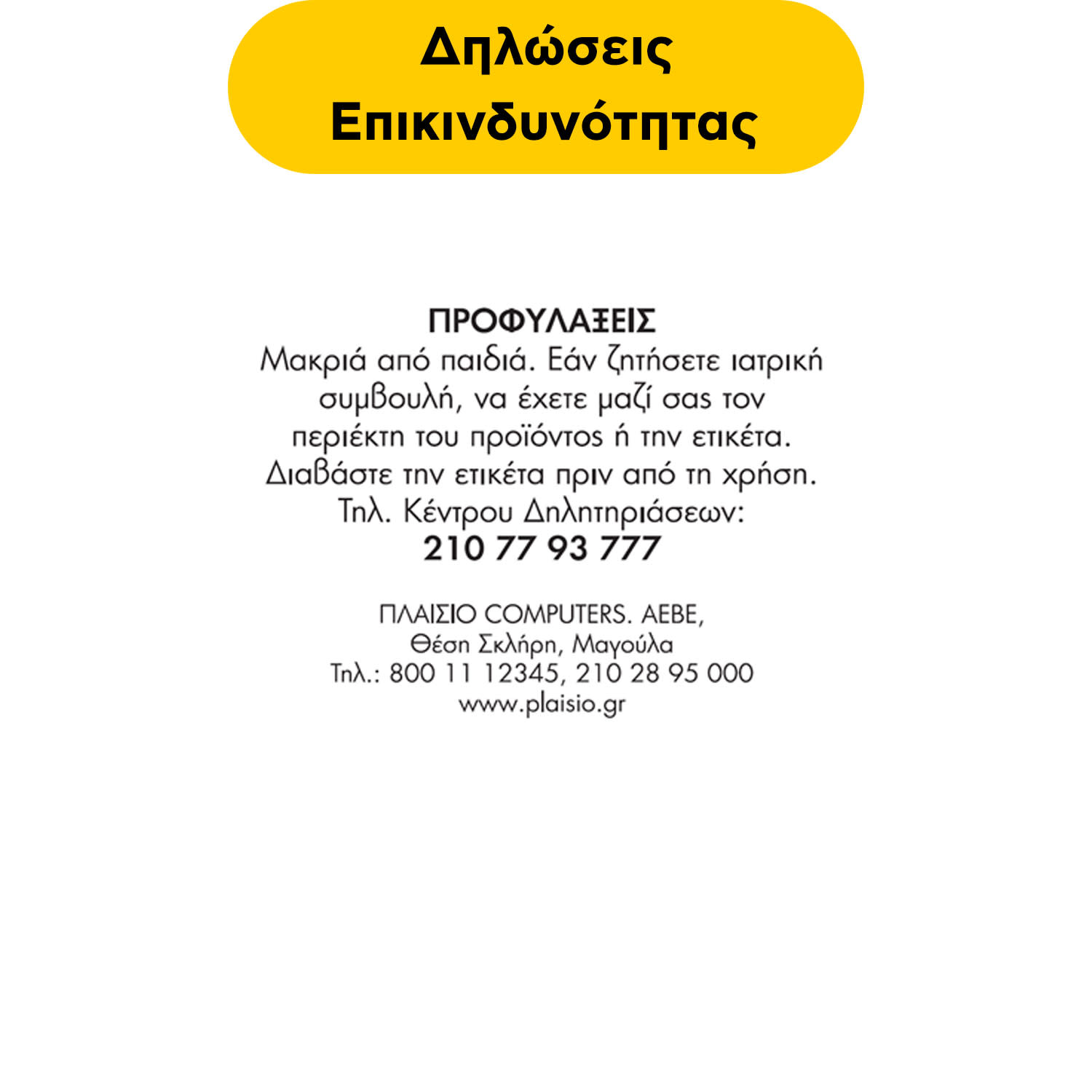 *Μακριά από παιδιά. Εάν ζητήσετε ιατρική συμβουλή να έχετε μαζί σας τον περιέκτη του προϊόντος ή την ετικέτα. Διαβάστε την ετικέτα πριν από την χρήση. Τηλ. ΚΕΝΤΡΟΥ ΔΗΛΗΤΗΡΙΑΣΕΩΝ ΕΛΛΑΔΑΣ: 210 77 93 777.